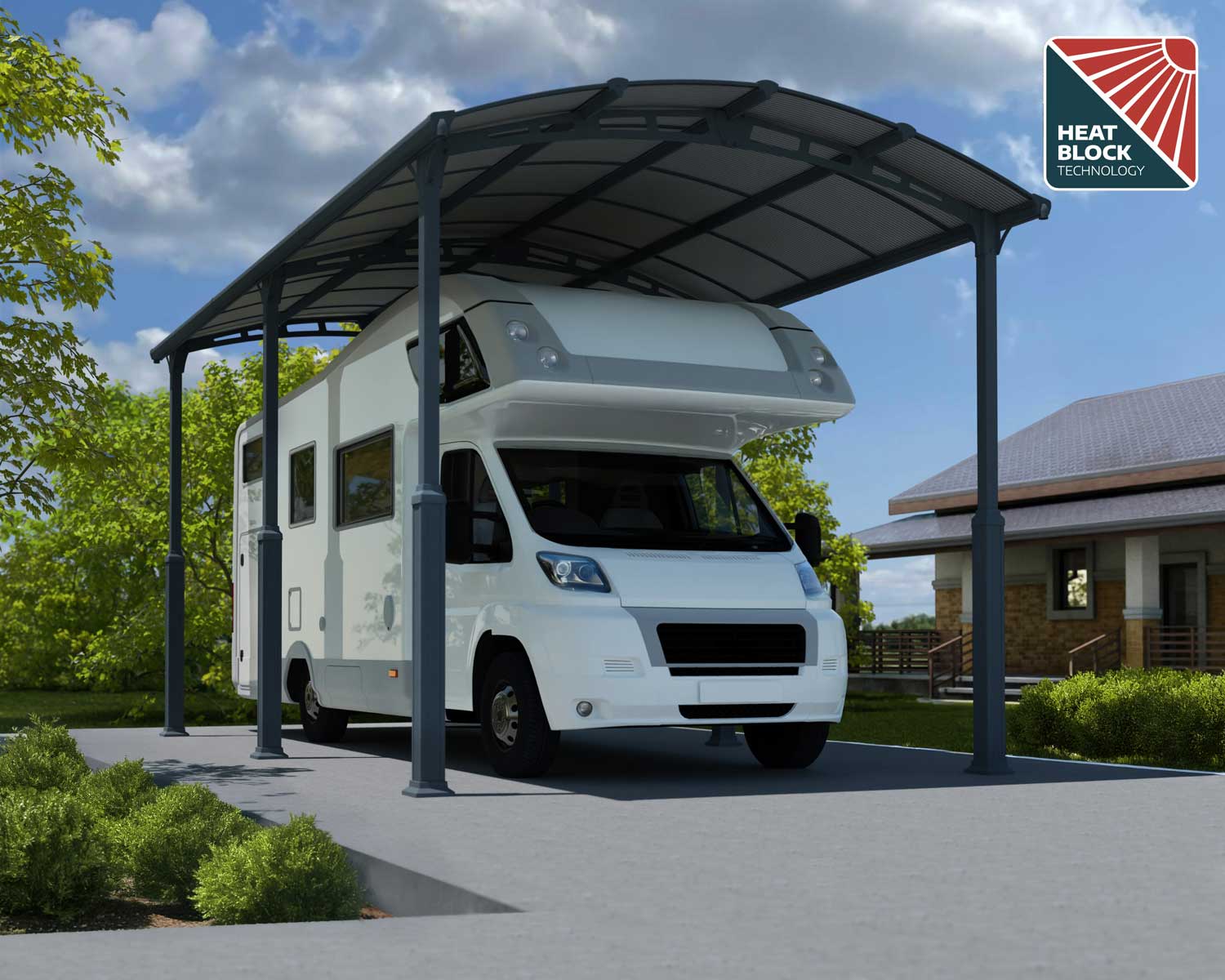 Have an RV or boat you want to protect from the sun and snow? We’ve got you covered. The Alpine RV Carport and Boat Shelter is a high-performance, durable structure designed to withstand the elements and protect your vehicle or boat with ease. The DIY tall carport is height adjustable to fit your needs even if they change over the years. The aluminum Carport protects your vehicle from color fading from the sun, and unnecessary scratches and damage. With over 10 feet of entry width and 7 feet of overhead clearance, the Alpine RV Carport gives you plenty of room to park and walk around your vehicle. This sturdy single carport also boasts a snow load capacity of up to 20.5 lbs/sq ft. Other features include a gutter to direct rainwater, high-impact twin-wall polycarbonate roof panels, and aluminum and galvanized steel rust-resistant powder coated frame. Extend the life of your boat or RV with the Alpine Carport Kit.