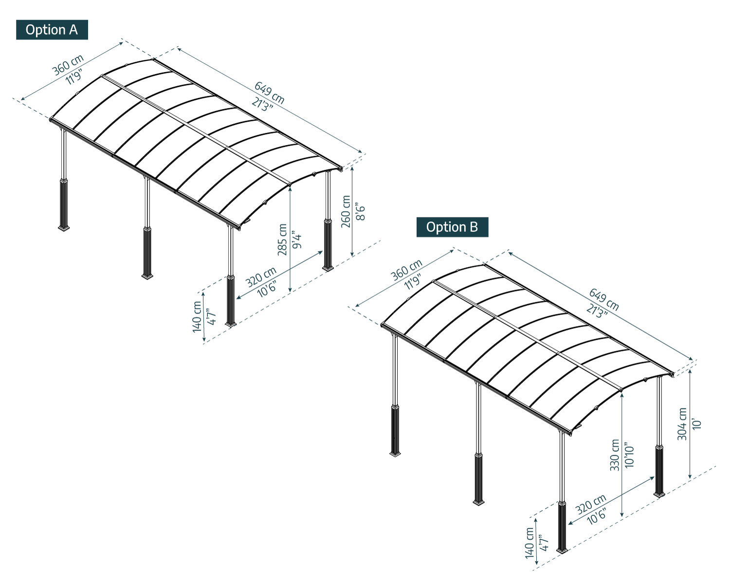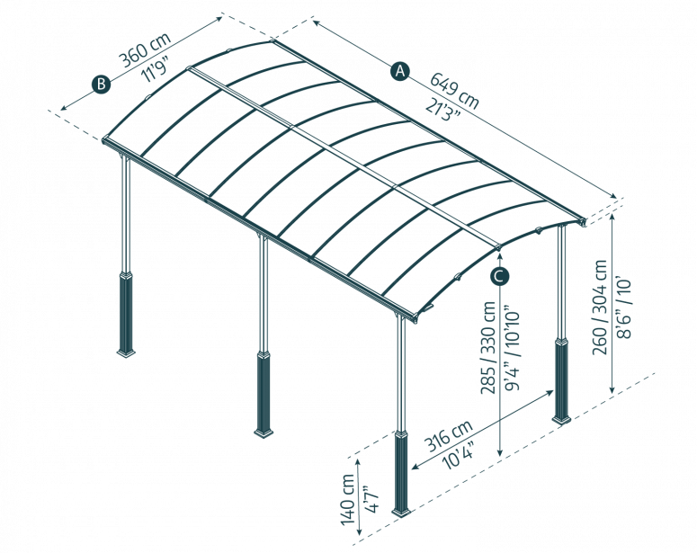 - Maximum carport’s height 11’7″ (352 cm)
