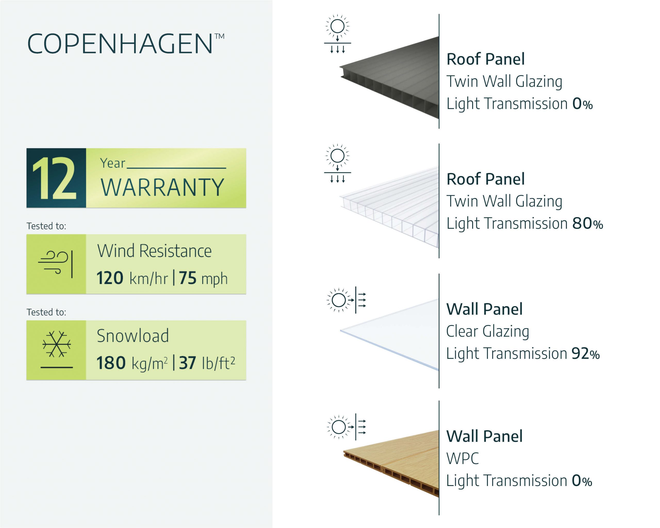 - Light Transmission: Sun panel and front panels have 100% light transmission. White roof panels and side walls have 80% light transmission.