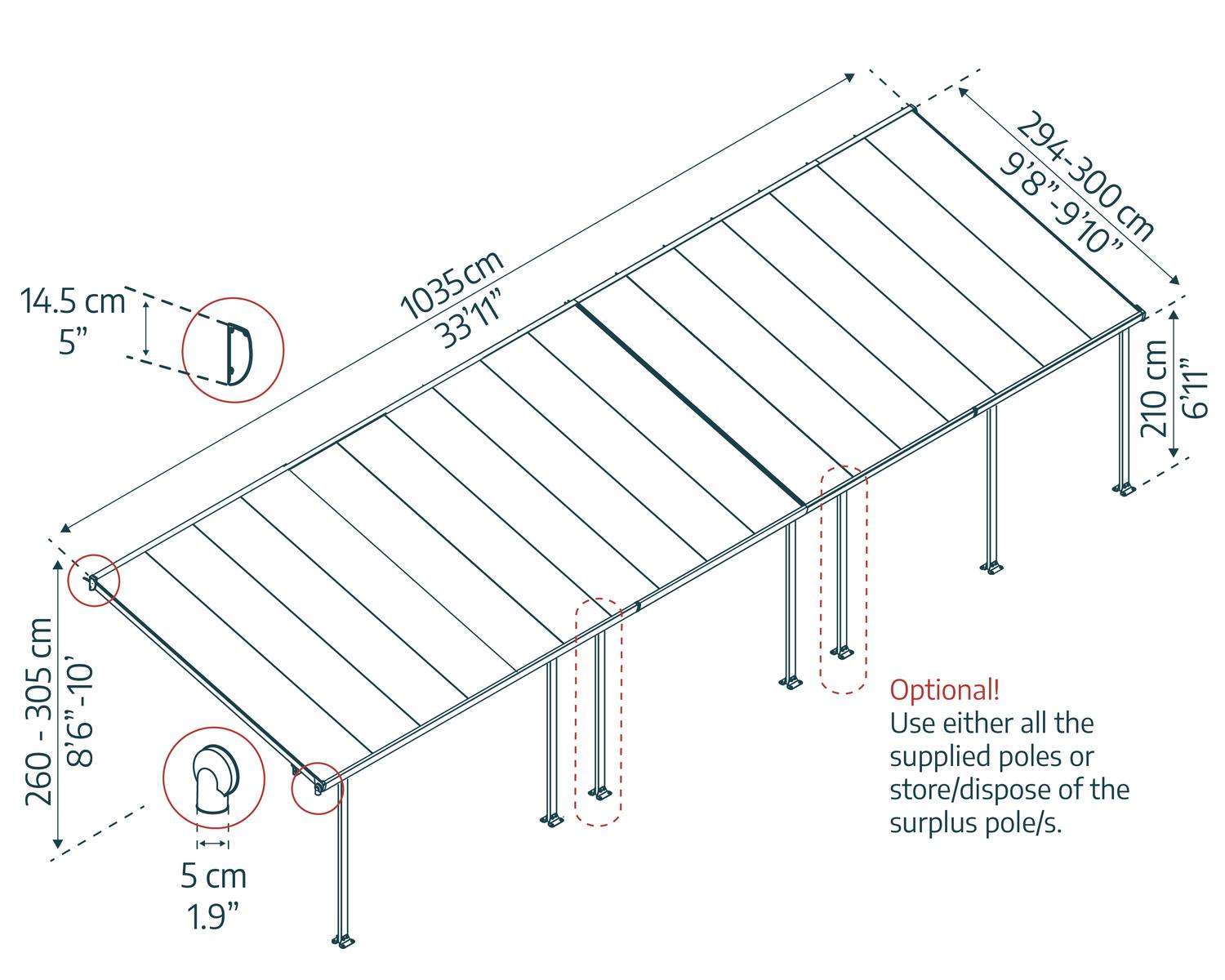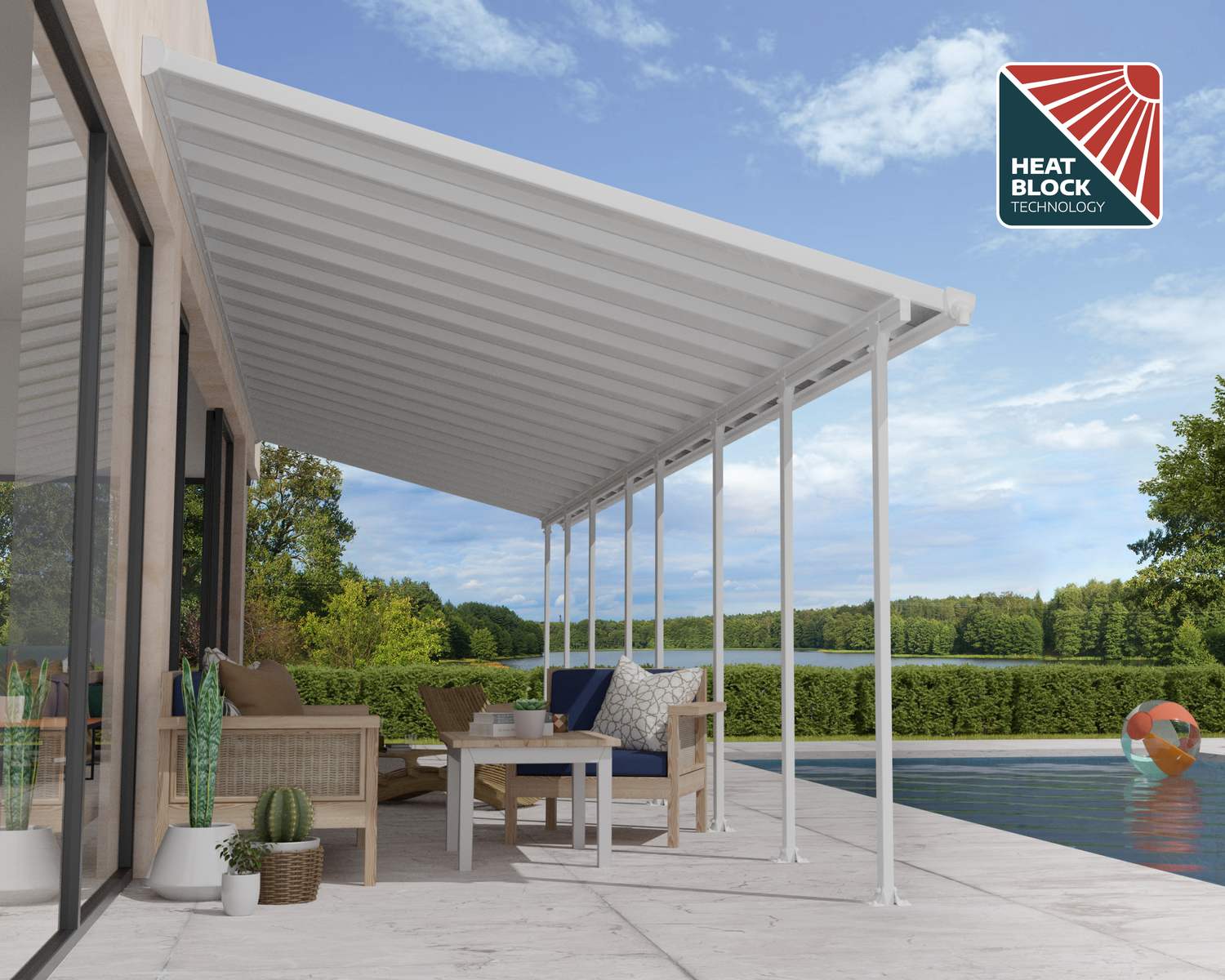 Enjoy warm days, cool nights, and everything in between under the extra-wide Feria Patio Cover. The Feria Patio Cover Kit is an attractive, maintenance-free roofing solution for various outdoor uses such as a patio cover, sun lounge, and carport. Protect your valuables from unpredictable weather and harmful UV rays with this high-performance structure. It features flexible positioning poles which enable you to set your required height at the wall connection, the distance from the house and between the poles at the front. It was designed to be simply assembled by 2 people, using the Click N’ Lock roofing system for safe and simple assembly, preventing leaks. It requires no experience, no special skills, and no special tools. The Feria Patio Awning provides your family with an elegant, beautifully crafted, sturdy addition to your outside living space that is sturdy and rust-free for many years to come.