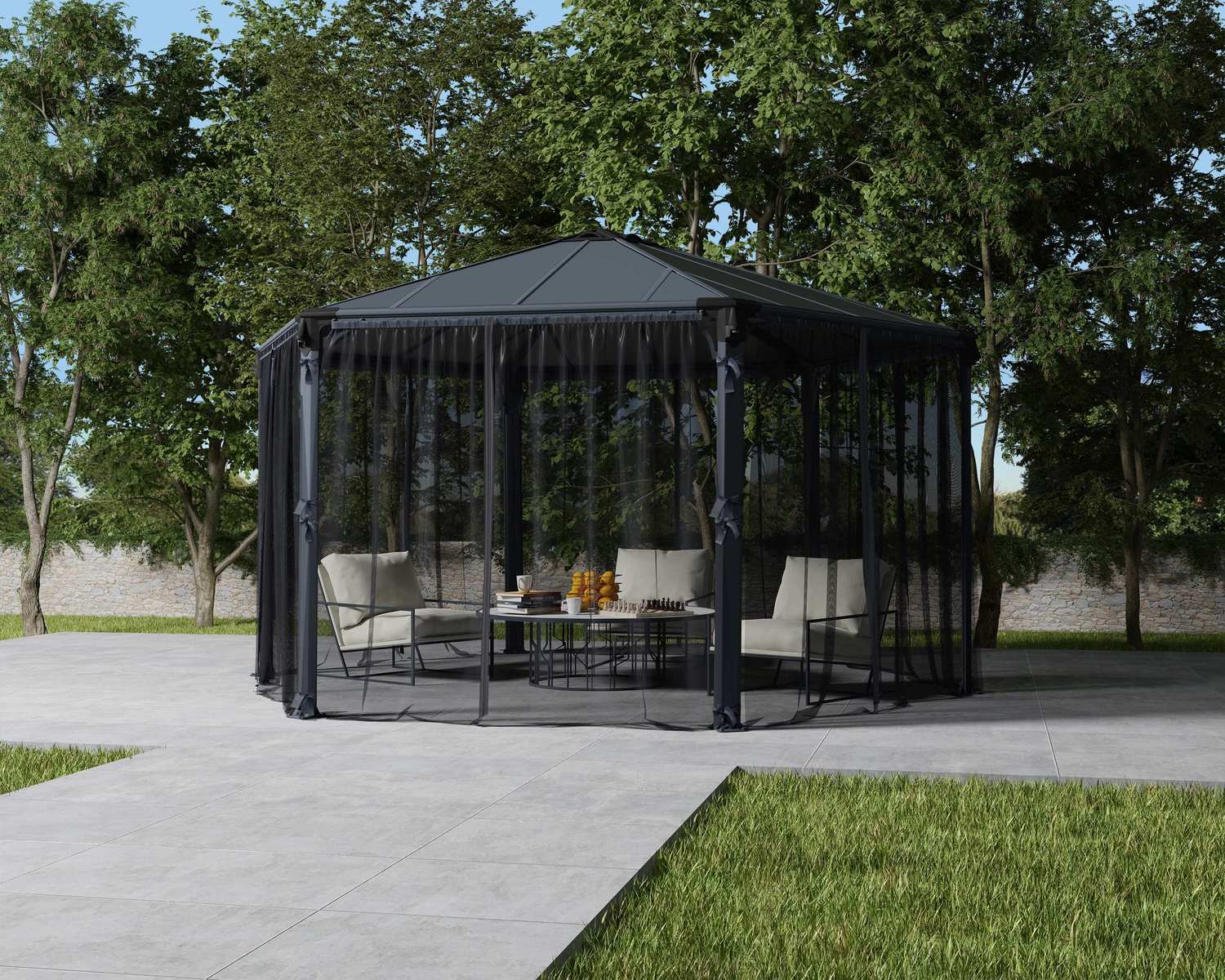 The Roma / Monaco Hexagonal Garden Gazebo Netting Set is aesthetically appealing and functional, it will add to your comfort by allowing airflow yet keeping out unwanted bugs. The lightweight polyester screen comes with hooks that slide into the clips at the track line of your Gazebo. This Netting Set was specifically designed to ensure compatibility with the Roma and Monaco Garden Gazebos. One package includes a set of six mesh fabric nets to cover your entire Gazebo; Easy to install and easy to use. Includes zipper to connect the screens together and ties to pull the screens to the corner posts.